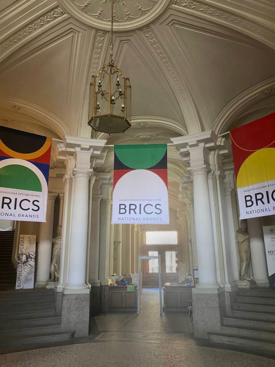 С 6 по 8 июня прошла уникальная выставка «Национальные бренды БРИКС» в историческом здании Санкт-Петербургской академии художеств имени Ильи Репина на Васильевском острове. Выставка отражает культурную идентичность стран и проходит в рамках Плана председательства Российской Федерации в БРИКС в этом году, а также приурочена к проведению Петербургского Международного Экономического Форума – ПМЭФ-24. На входе в Академию художеств вас встречает исторический холл с колоннами и резным потолком, с которого свешиваются плакаты с цветовой гаммой БРИКС и самим названием выставки. Сама экспозиция располагается в двух залах: первый – инсталляционный, а второй – кинозал. В первом зале располагается арт-инсталляция, в которой студенты Санкт-Петербургской академии художеств имени Ильи Репина отразили многообразный мир природы и национальной идентичности. В самом помещении расположены необычные колонны, на которых представлены символы каждого государства-участника БРИКС: капибара, попугай ара, слон,
