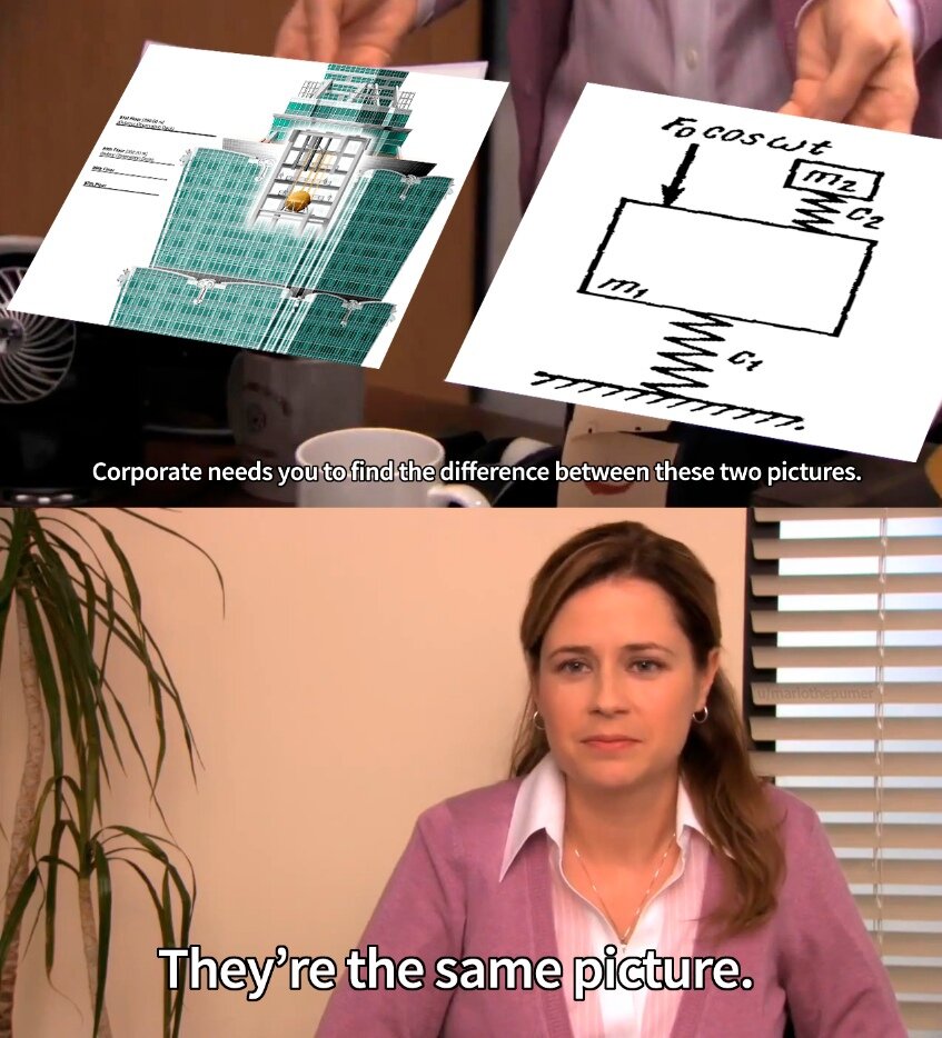 На практике это позволяет перенаправлять, например, сейсмическое воздействие на небоскрёбах. Ведь землетрясения - это, внезапно, тряска земли, самые что ни на есть колебания. Наш случай. Берем небоскрёб, вешаем внутрь грузик массой 660 тонн на тросиках – поздравляю, ваш Динамический гаситель колебаний™ готов! Так и поступили, например, строители небоскрёба Тайбэй 101 (иллюстрации прилагаются). К тому же динамический гаситель колебаний нашёл применение в строительстве мостов, буровых платформ, линий электропередач и автомобильной промышленности.