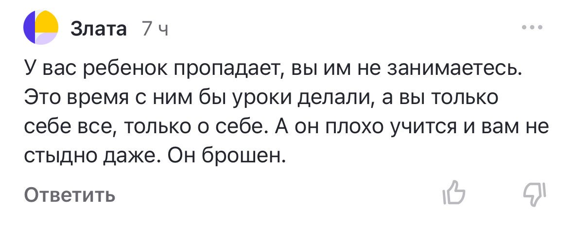 Так что Женю я полностью поддерживаю в ее начинаниях. И считаю ее прекрасной мамой, у которой все в порядке с сыном и их взаимоотношениями. А вот комментаторшу Злату я считаю злыдней. Наверное, она как-раз из тех нереализованных и несчастных женщин, которым только и остается, что сидеть в интернете и критиковать тех, у кого есть возможности и способности быть кем-то еще, кроме жены и матери.