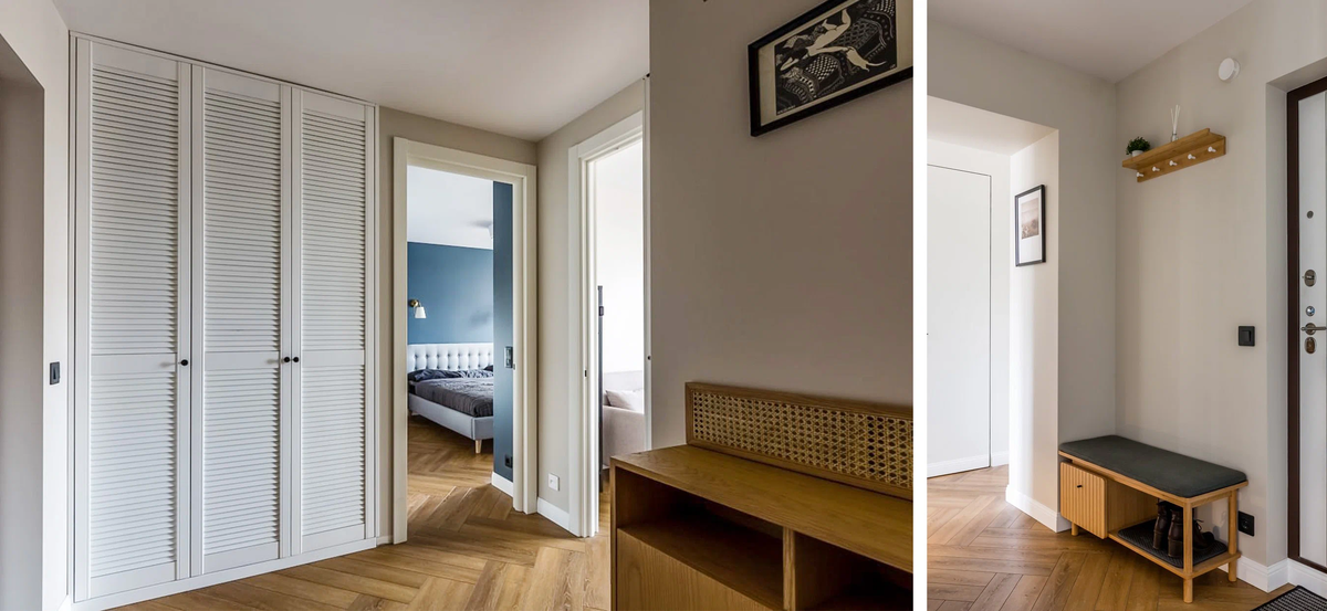 К строительству приступили в конце февраля. В квартире заново сделали электроразводку, поменяли все водяные трубы, канализацию, радиаторы отопления. Так как дом газифицирован, вызывали Мосгаз — мы решили не располагать кухню по длинной стене помещения, поэтому газовый кран, располагавшийся на короткой стороне, смежной с ванной, попросили опустить ниже. На следующем этапе расскажу, какой красоты это позволило добиться. Отдельно поработали над шумоизоляцией, которой в квартире фактически не было. По всем помещениям положили круговое «одеяло» звукоизоляции: системы Техносонус — по потолку и стенам, а на полу залили стяжку с отсыпкой керамзитом. В спальне усиленный эффект звукоизоляции даёт гардеробная: это дополнительная защита от шумного подъезда и соседей. Ещё один глобальный момент стройки — длинная лоджия, которая растянута на обе комнаты и занимает площадь 5,5 кв. м. Её с самого начала решили благоустроить — чуть-чуть подрезали парапет (это не является нарушением), за счёт чего полу
