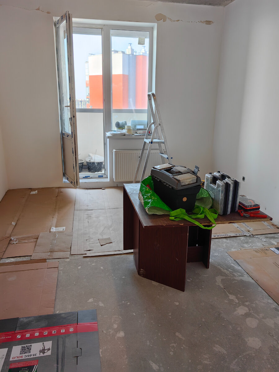 Мы любим красить, поэтому процесс шел приятно, тем более потолка и плинтуса еще не было.