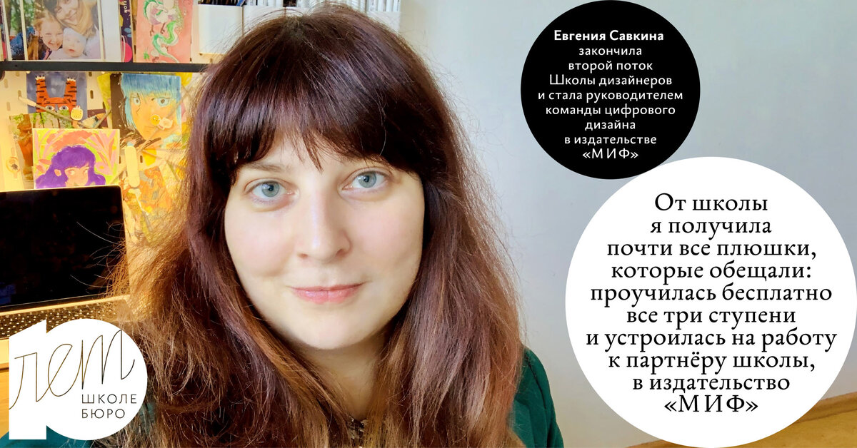 Евгения Савкина закончила второй поток Школы дизайнеров и стала руководителем команды цифрового дизайна в издательстве «МИФ». Евгения рассказывает свою историю: «Я училась во втором потоке Школы стажёров. Тогда не было разделения на дизайнеров, редакторов и руководителей — учили только дизайнеров. В школу меня позвал учиться друг дизайнер, мы с ним работали в одной компании. Он тогда учился в первом потоке, но понял, что не пройдёт на 3 ступень, и решил поступать ещё раз. Я помню, когда мы на работе обсуждали дизайны — меня впечатлили его комментарии. Не просто хорошо или плохо, а какие‑то конкретные штуки: выравнивание, польза, логика. Поэтому, когда он позвал меня поступать вместе на второй поток — я поняла, что мне это тоже надо. От школы я получила почти все плюшки, которые обещали: проучилась бесплатно все 3 ступени и устроилась на работу к партнёру школы, в издательство „МИФ“. У нас в „МИФе“ раньше была популярна книга про адскую неделю. Там бывший спецназовец рассказывал, как го
