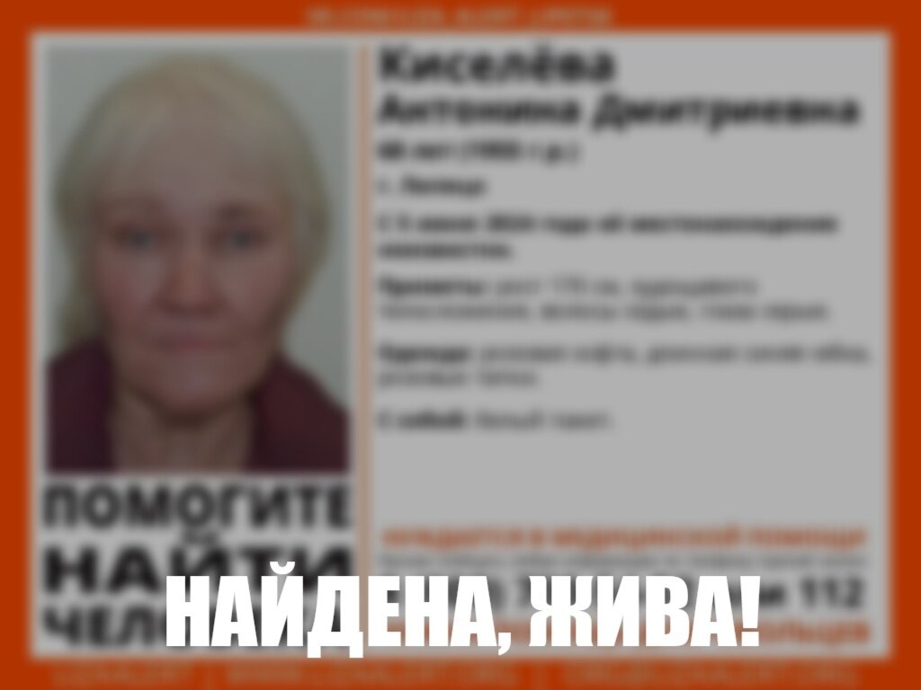 В Липецке нашли пропавшую 68-летнюю Антонину Дмитриевну Киселеву. Напомним, в минувшую среду, 5 июня, пенсионерка вышла из дома и не вернулась. Поиски осложнялись тем, что пожилая липчанка нуждалась в медицинской помощи. К счастью, все завершилось успешно. Бабушку нашли живой. — Найдена! Жива! Спасибо за помощь и участие в поиске, — прокомментировали волонтеры поисково-спасательного отряда «Лиза Алерт» по Липецкой области. К слову, в регионе продолжаются поиски 17-летнего Вити Сошнина. Подросток вышел из дома в Новой Деревне больше недели назад — 3 июня и не вернулся. Мальчик был одет в черную ветровку, майку черного цвета, черно-белые штаны в клетку и черные кроссовки с белой подошвой.