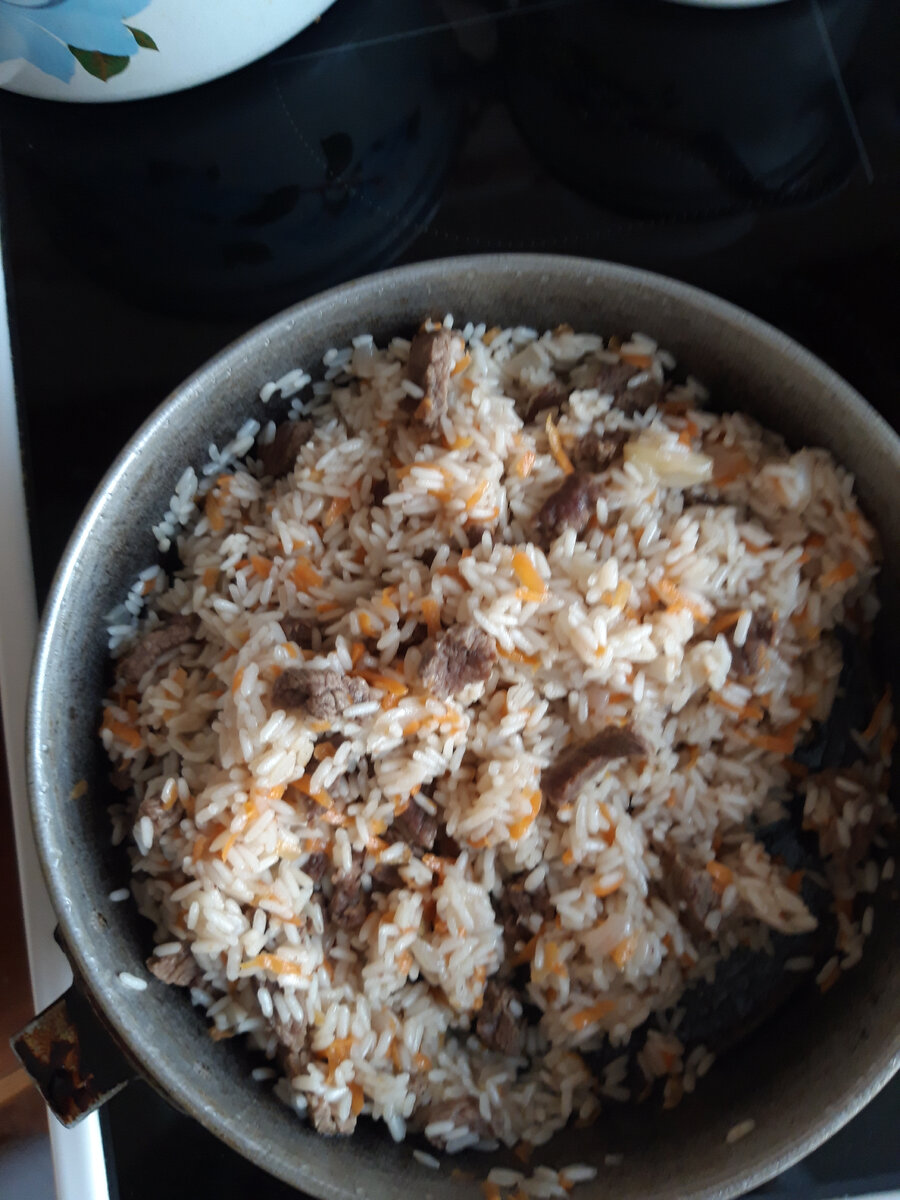 На сковороде с подсолнечным маслом обжарить лук, морковь тертый и мясо говядину затем постепенно добавляем рис и заливаем все 2.5 стаканами воды. 1луковица 2 моркови средние 2.5 стакана водв 2 стакана риса