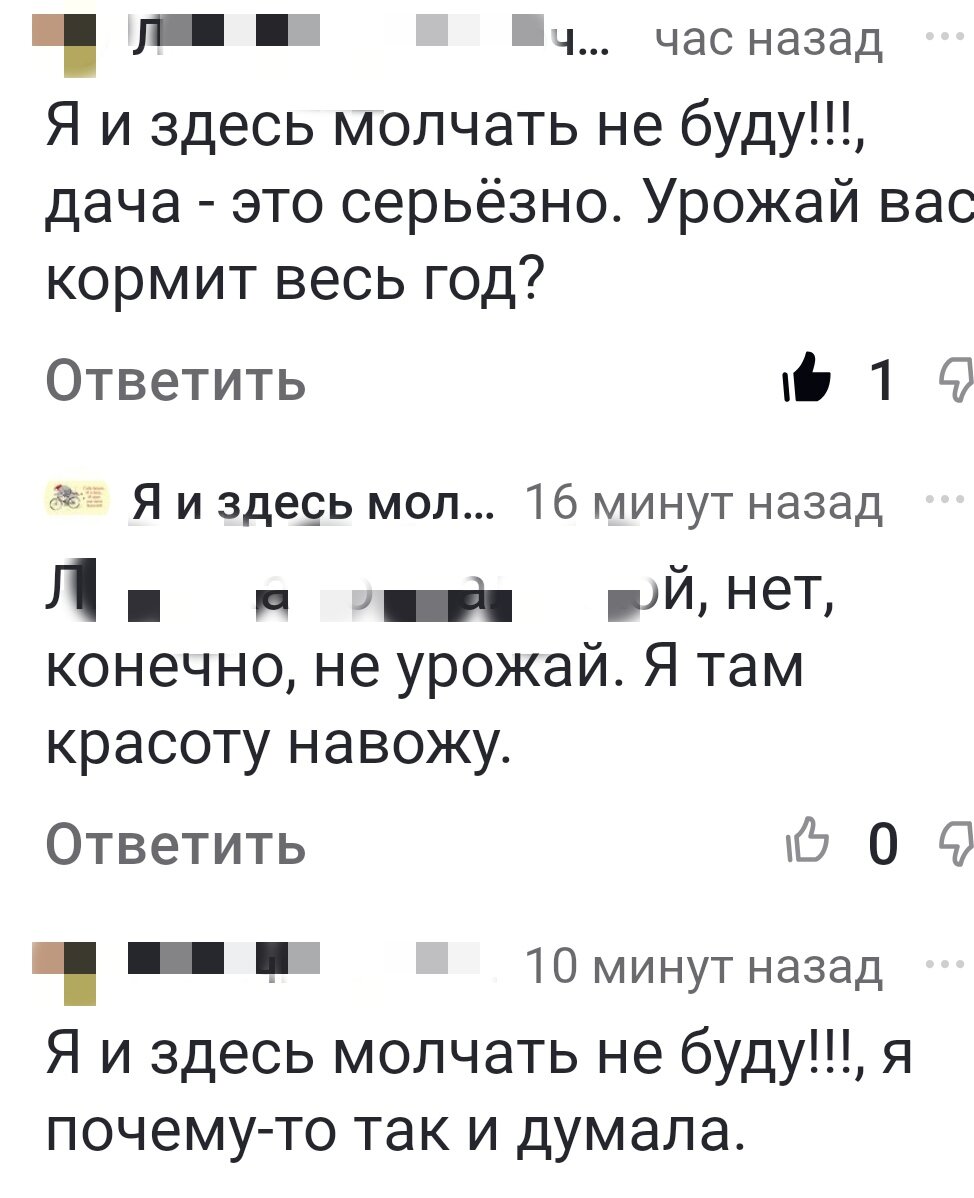 Недавно у меня состоялся такой диалог на Дзене. Встретились мы с в статье о поведении матерей, в ту пору, когда они стареют и становятся ленивыми и эгоистичными, которые постарев, никуда от себя не отпускают своих [взрослых и уже престарелых] "детей". Я оставила комментарий , что с такими мамами надо быть жёстче . Потому что, кроме ухода за родителями , есть еще другие интересы, дела и нужности. Например, дача и дачные дела. И вот наша переписка: И дальше мне преподносят тему для статейки: Отдых на даче от домашних, семейных дел - это вот так?🔻 В воскресенье я встала в 8 утра. Что бы "по прохладце" поработать. Сделала я не так уж много - сначала нафоткала цветы Одну клумбу очистила от сорняка, положила картон и сверху чёрный спанбонд. А украсила этот пирог стружечным опилом. Подняла ветви можжевельника Blue Star. Он теперь проветривает "пузо" и лучше виден издалека. Удалила из малины пырей и крапиву, посетовав, что я столько малины с участка не ем, сколько б