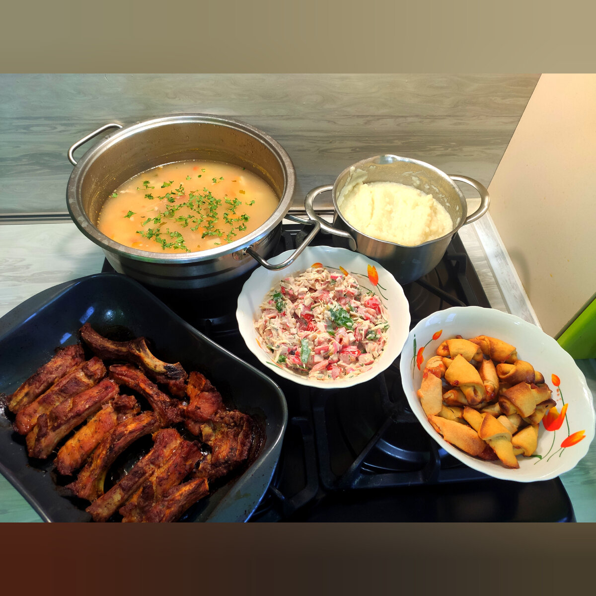 У меня всегда этот вопрос в голове 🤔 Сегодня у нас ✅ Гороховый супчик ✅ Картофельное пюре с запечеными рёбрышками ✅ Салатик из помидор, зелени, сыра, чеснока и заправка сметана+ майонез ✅ Рогалики с джемом на огуречном рассоле! Приятного аппетита ❤️