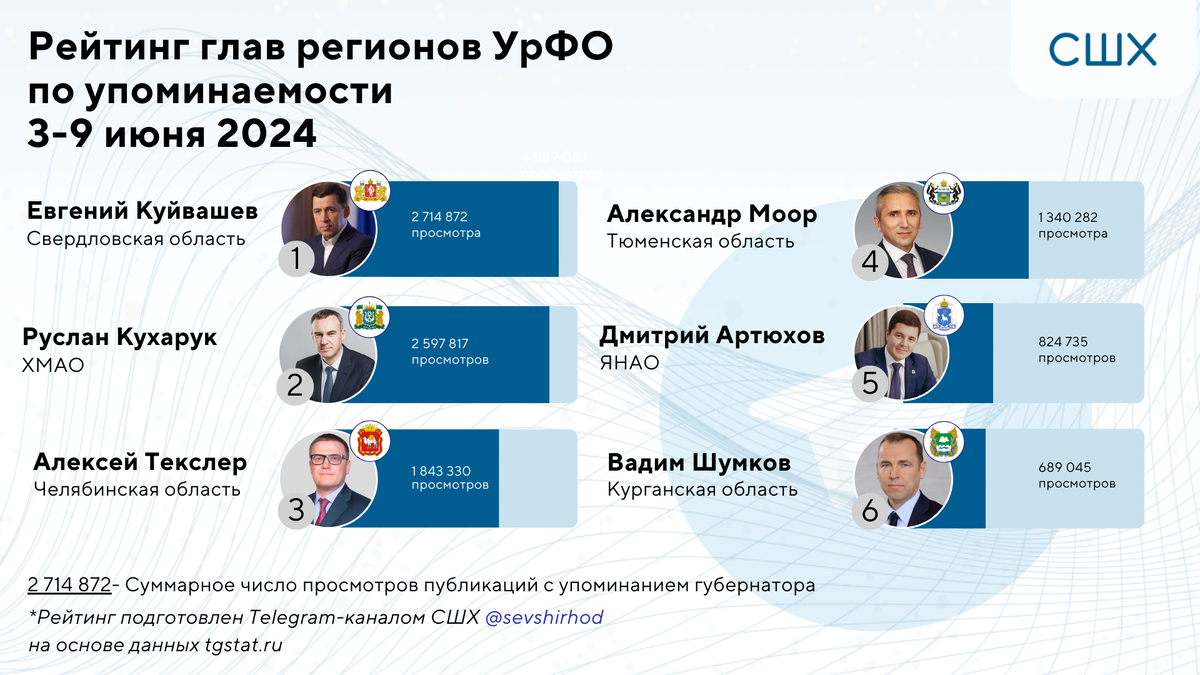 Долгожданное золото рейтинга у губернатора Свердловской области Евгения Куйвашева с 2 714 872 просмотрами и 798 публикациями. Ключевая новость – участие в Дне Урало-Сибирского макрорегиона на выставке-форуме «Россия», где ему удалось громко заявить о ключевых для Среднего Урала проектах. Куйвашев планирует создать экосистему «Космос», в рамках которой будут разрабатывать радио- и микроэлектронику, продукцию для авиакосмоса, робототехники и БПЛА. Также будет продолжен проект «Сухой порт», чья прогнозируемая мощность – 30 млн тонн.