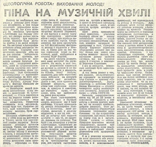 Одесскому горкому и райкомам комсомола, очевидно, не нужно ждать какого-либо указания «сверху», а самим направлять свой актив на те массовые культурные мероприятия, и, в частности, на концерты, которые вызывают повышенный интерес молодежи. Чтобы именно они, а не кучка хулиганов, были заказчиком музыки. Чтобы слово комсомольца-активиста, человека с активной жизненной позицией, с воспитанным художественным вкусом было решающим и в дискуссии о сегодняшней эстраде, и в оценке поведения своих ровесников.