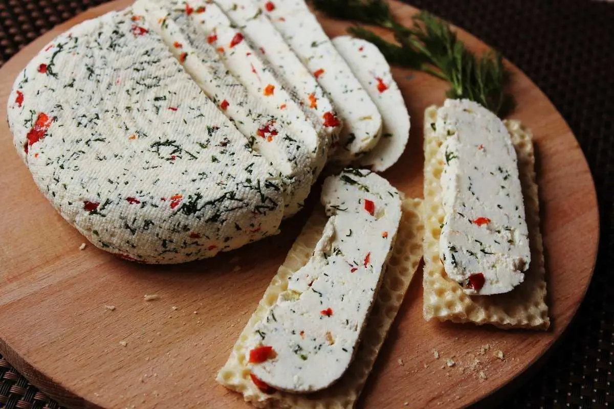 1 печеный красный перец или 2-3 вяленых томата Как готовить: В кастрюлю вылить молоко и кефир, нагреть до горячего. Взбить яйца с солью. В горячую молочную смесь тонкой струйкой влить яичную массу, быстро перемешать и довести до кипения. Варить молочно-яичную смесь в течении нескольких минут - до того, как начнет отделяться сыворотка, а молочная смесь створожится хлопьями. Снять с огня. Остудить 5-7 минут. Добавить чеснок через пресс и рубленную зелень. Перемешать. Перец или помидоры порезать кубиками и также ввести в смесь. Дуршлаг застелить марлей или чистым тонким полотенцем - края оставить свисающими. Вылить творожную массу в дуршлаг и дать стечь сыворотке почти полностью. Разровнять сыр лопаткой, плотно утрамбовать, накрыть концами ткани. Сверху установить гнет - банка с водой подойдет. Убрать в холодильник на 3-6 часов. Как остынет, затверд