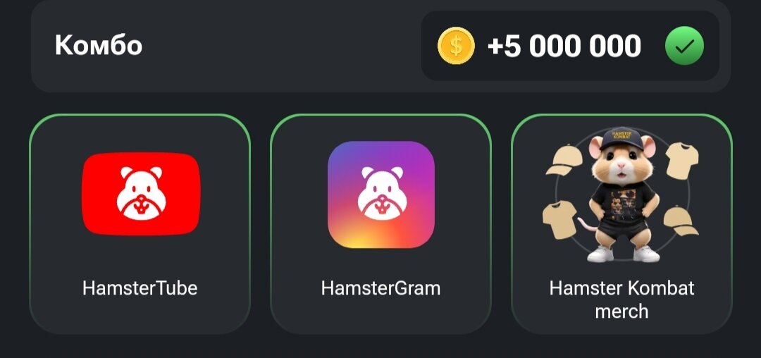 Для того, чтобы получить 5 000 000 в Hamster Kombat нужно открыть три секретные комбо карты. Для этого заходим в Hamster Kombat по ссылке Идём в раздел "Mine" и открываем там следующие карты: Shit Coins в разделе PR&Team HamsterGram в разделе PR&Team Hamster Kombat merch в разделе Specials 5000000 на сегодня Ваши! Если хочешь получить ещё, то от меня для новых пользователей 5000 монет в подарок Переходи по ссылке для получения подарка 5000 монет -