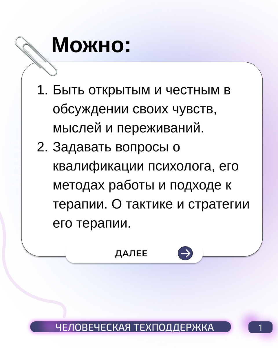 >> Установление четких границ в отношениях между психологом/психотерапевтом и клиентом играет важную роль в обеспечении профессионализма и эффективности терапевтического процесса. 📌 Важно помнить о том, что роли психолога и клиента должны быть четко распределены. Психолог не является другом, партнером или членом семьи. Его задача — профессионально вести терапевтический процесс в безопасных и этичных рамках, обеспечивая комфорт и прогресс клиента. Да, эти отношения могут напоминать дружеские, и быть довольно близкими, но всё равно это иной тип отношений, возможный только в таком вот терапевтическом альянсе. >> При малейших сомнениях относительно границ или некомфортных ситуациях крайне важно обсуждать это. Соблюдение границ защищает интересы обеих сторон и помогает терапии. Вот несколько примеров, которые помогут понять, что допустимо, а что работает как нарушение границ в терапевтических отношениях: 🧿 Хотите подробнее обсудить границы в психотерапии, узнать побольше, задать каверзные
