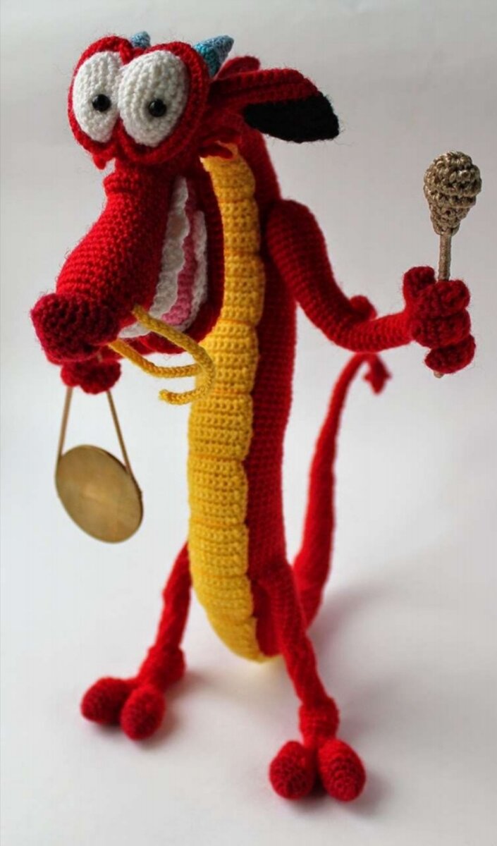 Деталь набиваем по мере вязания. Проволока проходит по всей длине, начиная от кончика хвоста и выступает из шеи при мерно на 10см (на длину головы дракона). В хвосте на кончике получится маленькая дырочка, но за счёт того что там проволока, наполнитель вылезать из хвоста не должен.