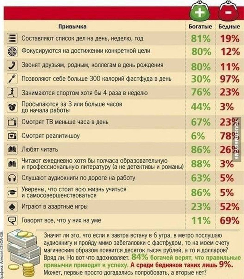 Мне кажется, что это просто шутка, проценты расставлены наугад. Некоторые пункты, однако, издали похожи на правду. Практически все мои знакомые обеспеченные люди действительно занимаются физкультурой, читают книги и… стараются вести себя вежливо, даже если они сильно удивлены или недовольны собеседником.