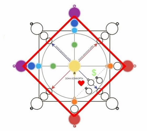Первый квадрат повернутый он же ромб. Это личный квадрат здесь будут находиться энергии, которые непосредственно связаны с человеком его личные характеристики. Второй квадрат родовой - здесь находятся энергии, которые расскажут о задачах и о ресурсах, которые пришли к нам от рода. Горизонтальная линия от А до В, это энергия земли. Энергии, стоящие на ней будут рассказывать о материальном мире. Физических аспектах: здоровье, деньги и все то, что можно пощупать. Вертикальная линия от Б до Г называется линя неба. Стоящие на ней энергии будут рассказывать о духовном мире человека, т.е. эмоции чувства и все то, что нельзя пощупать. Диагональная линия слева от Е до И это линия мужского рода, энергии стоящие на ней расскажут о карме рода отца и в первую очередь о фигуре самого отца. А также всех родственников мужского пола. Диагональная линия справа от Ж до З это линия женского рода . Энергии, стоящие на ней расскажут нам о карме рода матери. И о фигуре самой матери. А также всех родственнико