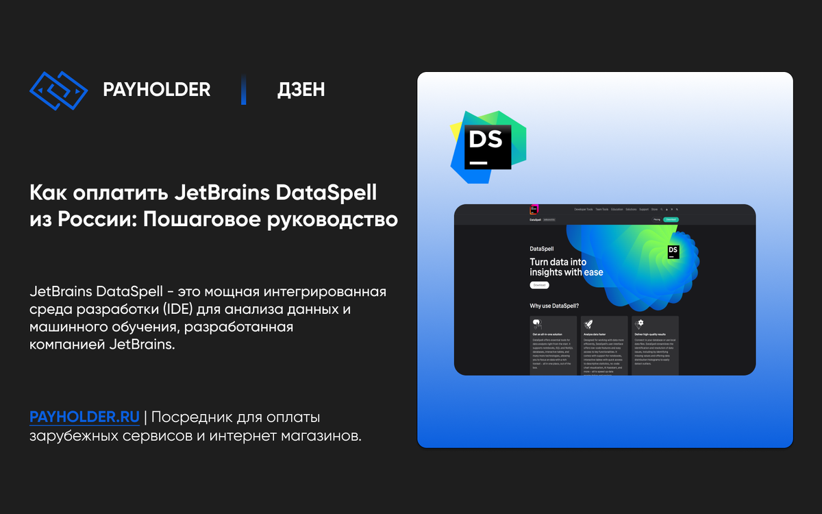 JetBrains DataSpell - это мощная интегрированная среда разработки (IDE) для анализа данных и машинного обучения, разработанная компанией JetBrains. Она предлагает инструменты для написания, отладки и анализа кода, поддерживая множество библиотек и фреймворков для работы с данными. Однако пользователи из России могут столкнуться с трудностями при оплате подписки на DataSpell из-за текущих ограничений. В этой статье мы рассмотрим, как оплатить DataSpell из России с помощью PayHolder, чтобы продолжить использовать все возможности этой платформы.
