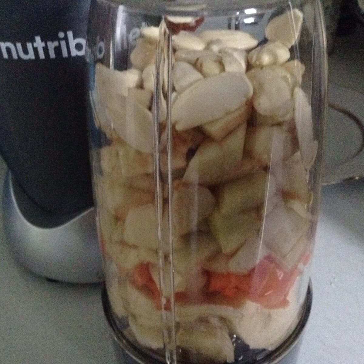 В составе нашего пюре сегодня будет очищенный от кожуры высушенный миндаль, красные яблоки, банан, морковь, мёд вместо сахара и немного воды. Немного воды добавить - получается пюре, добавите больше воды - получится смузи. Все ингредиенты слоями поместил в ёмкость на 700 мл, мёд и воду добавил в самую последнюю очередь, работа блендера не превысила 60 секунд и этого времени хватило чтобы превратить в однородную массу не только фрукты-овощи, но даже орехи, не осталось ни одной крупинки. Получилось вкусно, сразу ощущается благородный ореховый привкус. В меру сладкий, я положил всего лишь одну чайную ложку мёда, кто любит послаще - можно две. Воду добавляю только бутилированную минеральную, разумеется без газов. Можно подавать в чашках или пиалах, приятное на вкус, воздушная консистенция. Съедать надо сразу, пока свежее и необветренное. Если вода начала отщёлкиваться, то ложкой ещё раз всё перемешать. Если хочется съесть морковь, но нет желания тереть морковь и есть её с жёстким сахарным