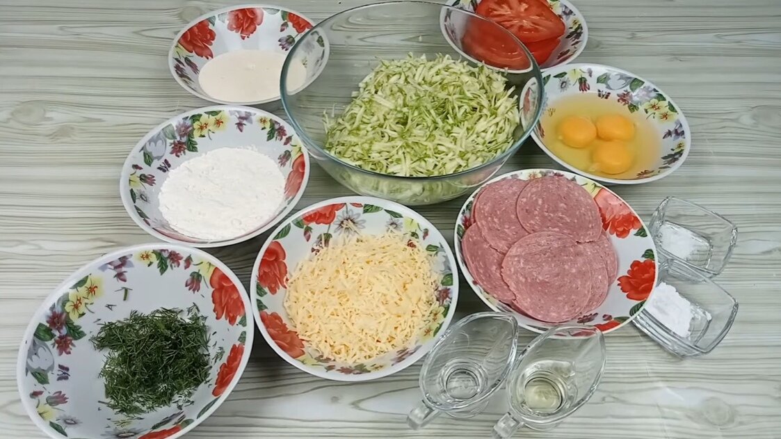 Понадобится: Кабачки - 400 г. Колбаса - 200 г Твердый сыр - 100 г. Мука - 75 г. Манка - 75 г. Помидор - 300 г. (1 крупный) Яйца - 3 шт. Укроп - пучок Сода - 1 ч. л. Уксус - столовая ложка Растительное масло Соль - по вкусу Приготовление: Кабачок натираем на терке и отжимаем, если он слишком сочный. К натертому кабачку добавляем яйца, соль, укроп. Перемешиваем. Добавляем манную крупу, муку. Перемешиваем. Гасим соду уксусом и перемешиваем. Даем постоять 15–20 минут. Форму смазываем растительным маслом (у меня стеклянная, d = 32) и заполняем ее тестом. На тесто кладем нарезанную колбасу, помидоры и тертый сыр. Отправляем в заранее разогретую духовку на 180 градусов минут на 25–30. Приятного аппетита! Присоединяйтесь к нам, здесь так вкусно!