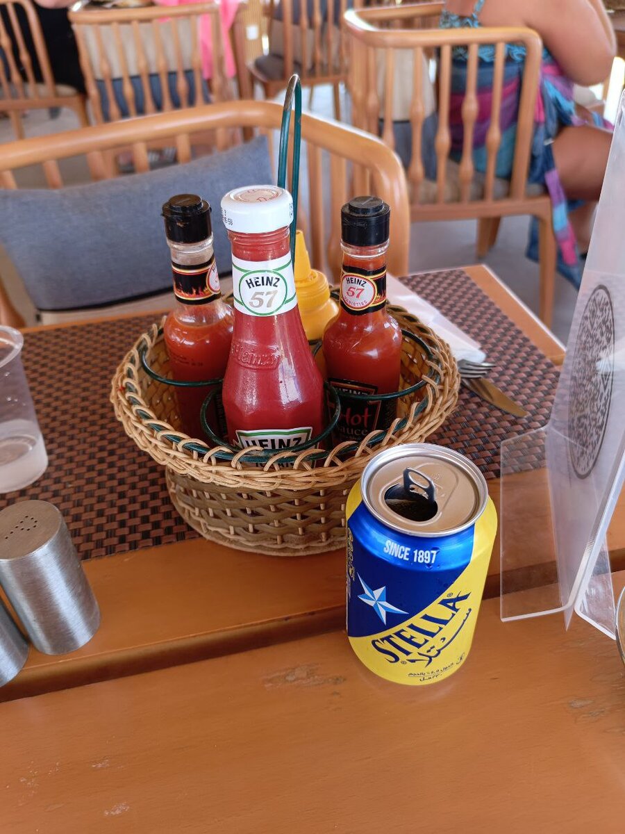 Всем привет, дорогие друзья! Прошло уже несколько недель с тех пор, как мы вернулись из отпуска из Египта. А материал начинает выходить только сейчас. Но пока статья про основной ресторан с 7 кухнями мира находится в разработке, я расскажу про пляжные бары. Ведь даже тут есть о чём рассказать. Во-первых, стоит немного рассказать про особенности отеля. The V Luxury Resort - это бывшая часть отеля Pyramisa. С дополнительными постройками, ребрендингом, но часть. И гости отеля The V Luxury Resort могут в полной мере пользоваться всеми услугами своего отеля и услугами отеля Pyramisa. Прикольно, правда?) Пляжный бар The V Luxury Resort В основном буду рассказывать про него. Уж очень мне тут понравилось. Тут новее мебель, всё аккуратнее и комфортнее. Именно тут делают бургеры, хот-доги и потрясающее мороженое. На каждом столике - корзинка с соусами. На пляжах я такого ещё не встречал. Кстати, на фото ниже вы можете увидеть местное пиво. Других вариантов не было. Если интересны мои впечатления