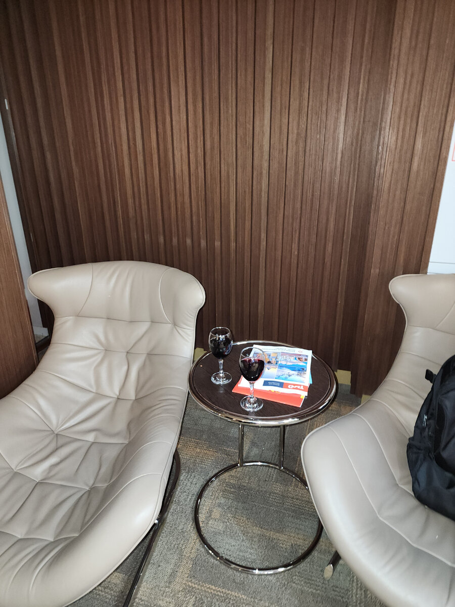 В бизнес зале предложили по бокалу вина. Был шведский стол, где на выбор один суп, один вид второго блюда, салат и другие мелочи. Имеется душевая, санузел чистый и приятно пахнет. Очень комфортно и приятно прошло ожидание поезда, также для посетителей бизнес зала предусмотрен закрытый красиво обустроенный отдельный двор, в котором также можно ожидать и курить. Выход на посадку к поездам также с этого дворика, единственное неудобство - нести чемодан по высокой лестнице.