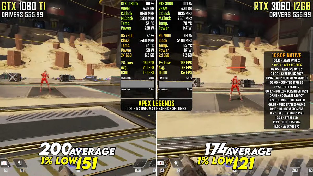На YouTube-канале NJ Tech проверили в Full HD с Native Resolution производительность GTX 1080 Ti и RTX 3060. Alan Wake 2 запускалась с пресетом High, DLAA/FSR2. В среднем с GTX 1080 Ti в этой игре удалось получить 39 к/с, с RTX 3060 — 49 к/с. Apex Legends тестировалась с максимальной графикой. Средняя частота кадров составляла в игре 200 к/с (с GTX 1080 Ti) и 174 к/с (с RTX 3060). В игре Cyberpunk 2077 на высоких настройках графики средняя производительность составляла 73 к/с (GTX 1080 Ti) и 81 к/с (RTX 3060). Call of Duty Modern Warfare II запускалась с ультра-пресетом и SMAA. Средний FPS в этой игре находился на уровне 83 к/с и 84 к/с (с GTX 1080 Ti и RTX 3060 соответственно). Counter Strike 2 с пресетом Very High шла со средней частотой кадров 292 к/с (GTX 1080 Ti) и 235 к/с (RTX 3060). PUBG Battleground тестировалась с ультра-графикой, DX11-E. Средний FPS в этой игре составлял с 1080 Ti — 144 к/с, с RTX 3060 — 115 к/с. Со всеми результатами тестирования вы можете ознакомиться ниже