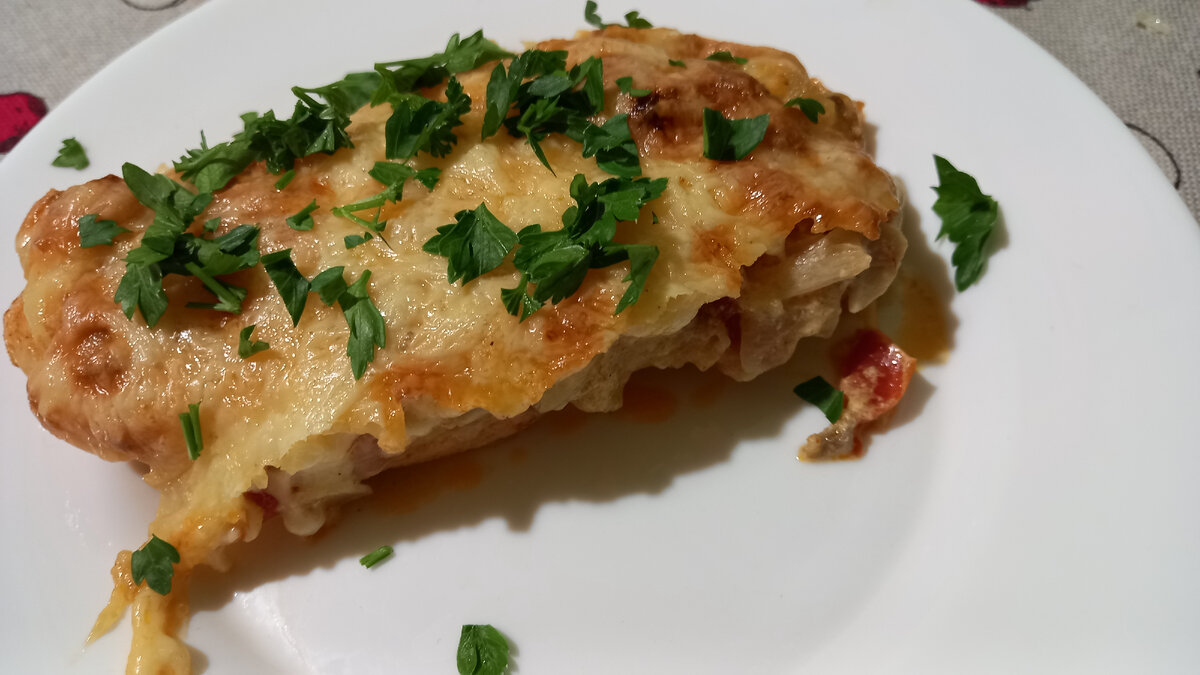 Куриное филе разрезаем на слайсы. В миску наливаем растительное масло, соль, молотую сладкую паприку, приправу для курицы. Кладем в этот соус грудку. Режем шампиньоны, лук и помидоры кубиками. Обжариваем. Далее кладем сметану и немного муки, солим, перчим. В форму для запекания выкладываем филе, на нее начинку с шампиньонами. Посыпаем все тертым сыром. Ставим в духовку до готовности.