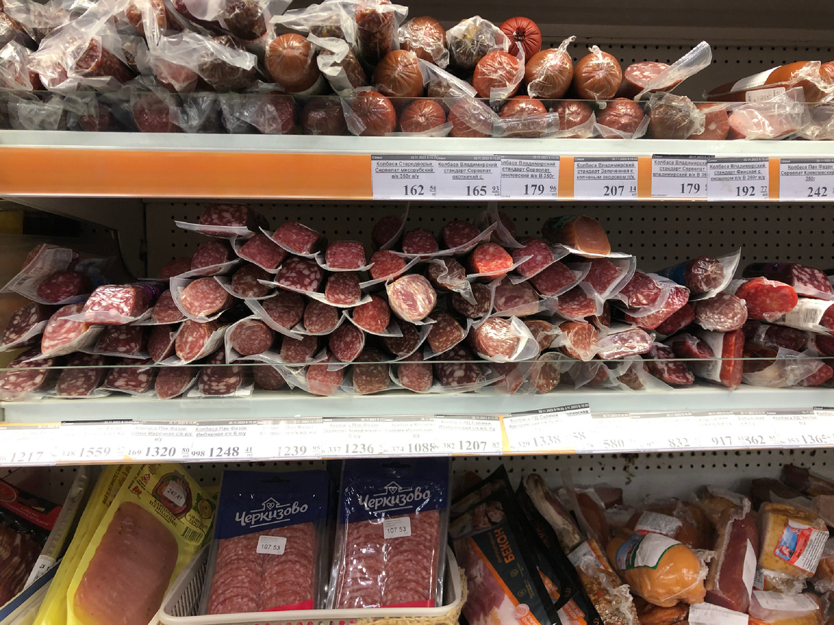 Вернулись мы в Алчевск в ту же гостиницу, в свои прежние номера, будем здесь до конца недели жить. Я очень сильно устала, но надо идти в магазин, что-нибудь купить поесть. Сходила в супермаркет СъЕМьЯ и ушла с пустыми руками. Не пойму чего мне хочется и цены не пойму. То за килограмм пишут, то за 100 грамм, то за тот кусок, что на витрине. ⬆️Например, вот на средней полке цена в тысячах за килограмм. На верхней в сотнях за те 300-350 грамм, что на витрине. Я сначала на среднюю полку глянула, чуть инфаркт не хватил. Потом разобралась. Цены на что-то высокие, а на что-то как у нас, например, на мясо и сыры вполне себе. Молоко дорогое. Больше ста рублей! Я в Сочи в сезон за 70-80 покупаю. В пакетах молоко тоже стоит не меньше - 123 и даже 176 рублей! Есть собственная продукция. Тут на средней полке указано: Сделано в ЛНР. Цены нормальные. Так и хочется приписать: макарошки всегда стоят одинаково. 😀 Крупы тоже. Гречка так вообще порадовала - 61 рубль. Фрукты-овощи стоя