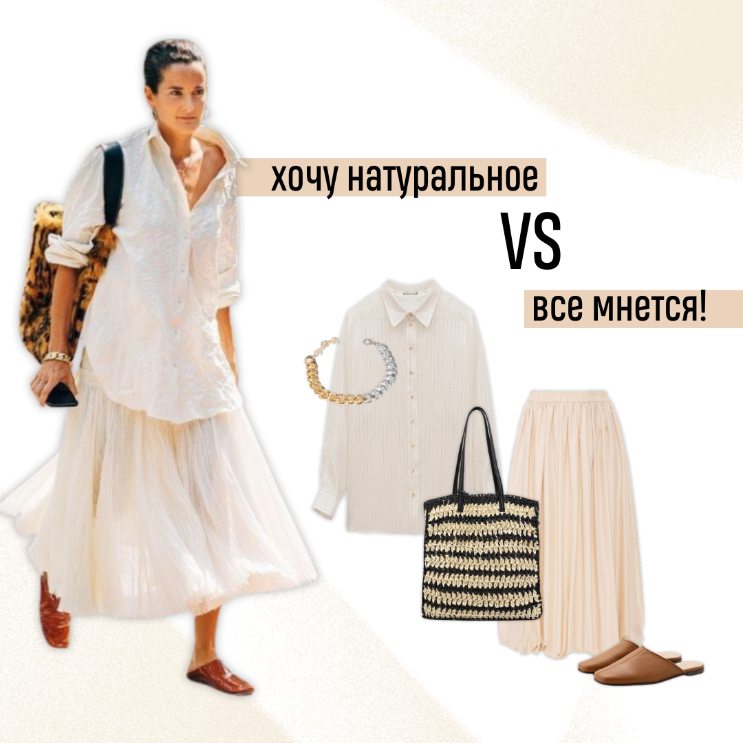 «Чтобы натуральное и не мялось» – это как «есть и не толстеть»💔 Зачем нам натуральное? Потому что дышит и не жарко☀️ И не блестит предательски дешево, как это ваш полиэстер. Но мнется. А хочется, чтобы нет🤔 Заменим «натуральное» на «приятное к телу» и «без дешевого блеска». Может ли такая вещь не мяться? Уже да! Берем натуральное, переплетаем с полиэстеровыми волокнами. Получаем меньше работы утюгом и простоту ухода👌🏻 А еще вискоза: это не синтетика, потому что делается из целлюлозы, то есть, из древесины. Но обрабатывается химически. Так у нас все обрабатывается: и хлопок, и шерсть, и шелк. Вискоза не жаркая, если блестит, то в рамках приличия. В чистом виде все равно мнется, поэтому лучше смесовая. Если вискозу сделать из бука, получится модал. Он очень приятный к телу. Если из эвкалипта – лиоцелл. Если использовали кокосовое волокно, то купро. 💡Другой вариант – вычеркнуть из уравнения «не мнется». Лен мнется, но в этом его обаяние: ни одна льняная вещь не похожа на другую. Мяты