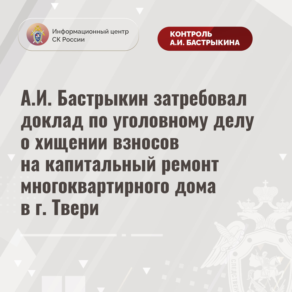 А.И. Бастрыкин затребовал доклад по уголовному делу о хищении взносов на капитальный ремонт многоквартирного дома в г. Твери