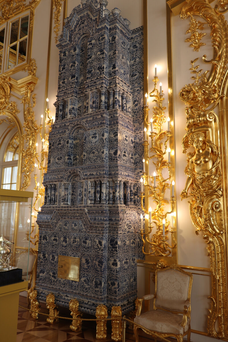 Если вы были в Екатерининском дворце в Царском Селе, то наверняка помните, какое впечатление производит его главный парадный зал. Большой зал настолько огромен, что даже десятки туристов, которые там постоянно находятся, теряются в этой огромной площади. А теперь подумайте о том, каково было всю эту огромную площадь натопить до приемлемой температуры, особенно, учитывая, что окна в этом зале с двух сторон и они занимают почти всю площадь стен, то есть, тоже огромные. Недаром в соседних залах стоят такие огромные печи от пола до потолка, украшенные изразцами. Печи эти появились в Екатерининском дворце ещё когда в нем жила Елизавета Петровна. Но печи сразу заложили монументальные, в стиле барокко, украшенные красивыми изразцами и керамическими балясинами: «…Растрелли, проектируя отопление дворца, вводил в его интерьеры печи, игравшие огромную декоративную роль на всей протяженности анфилады..» То, что сейчас видят туристы, очень даже впечатляет. Но на самом деле это – реконструкция по до