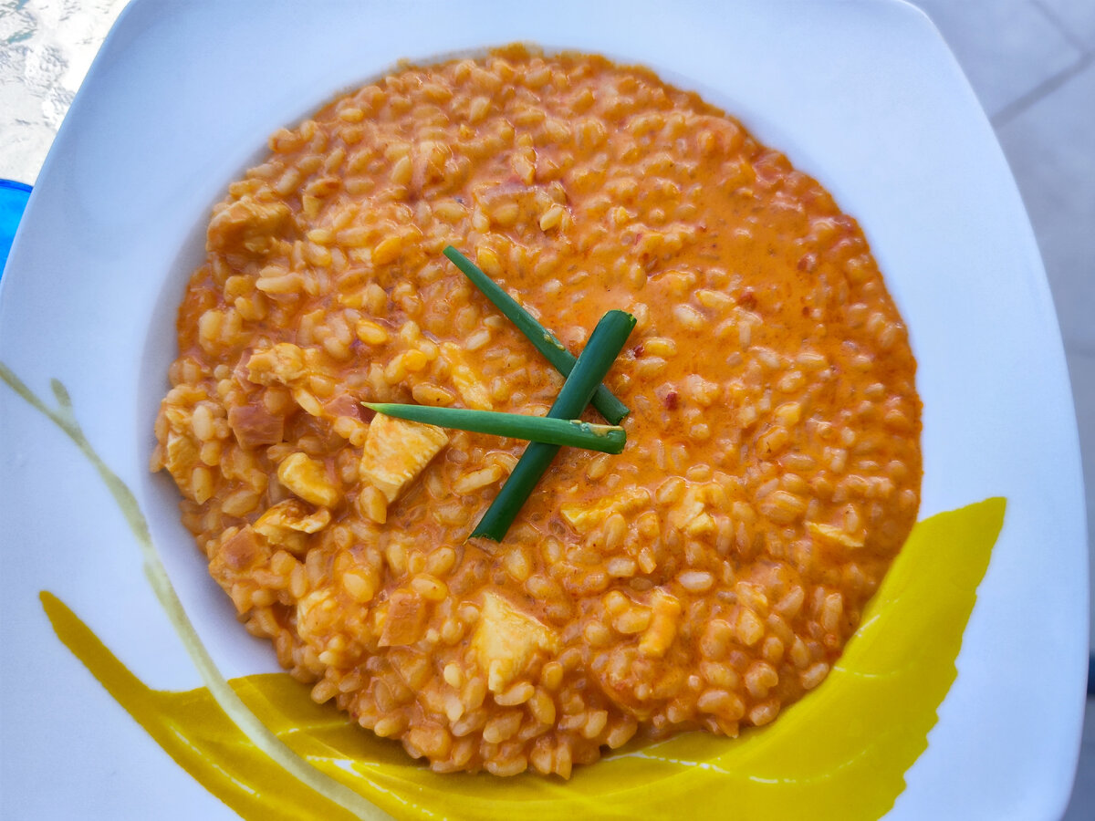 Достаточно простое, быстрое и невероятно вкусное ризотто! Все ингредиенты просты и обычно всегда есть дома. Ингредиенты: Приготовление: Обжариваем куриное филе и лук до румяной корочки, добавляем рис и слегка обжариваем. На этом этапе можно добавить вино (по желанию) и выпарить его немного. Затем добавляем томатную пасту и воду. Воду добавляем постепенно, пока не войдет вся. Приправляем солью, сахаром и перцем. Готовьте на медленном огне. Когда рис впитает практически всю воду, добавляем сливки и готовим, пока консистенция не станет кремовой, а рис полностью не приготовится. Если вся жидкость испарилась, а рис еще не готов, добавьте немного воды. В конце, по желанию, можно посыпать пармезаном (я этого не делала). Выложите ризотто в тарелку с углублением и слегка постучите по дну, чтобы оно равномерно распределилось. Можно украсить блюдо зелёным луком, как это сделала я. Приятного аппетита! Спасибо, что дочитали до конца!
