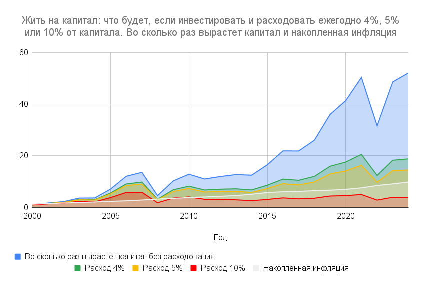 Короткий ответ: в 20 раз больше, чем вы тратите в год. То есть можно расходовать не более 5% инвестиционного капитала ежегодно, чтобы оставшийся капитал сохранял покупательную способность. Если тратить больше, есть риск того, что оставшийся капитал не сможет обгонять инфляцию. Это актуально для всех, кто хочет создать источник пассивного дохода от инвестиций. Например, если вы хотите иметь 1 млн. рублей пассивного дохода в год, ваш инвестиционный капитал должен быть как минимум в 20 раз больше, то есть 20 млн. рублей. При этом капитал должен инвестироваться, что помогает обгонять инфляцию и наращивать покупательную способность. Рассмотрим на примере портфеля ценных бумаг, состоящего из российских акций. Для расчетов мы возьмем статистику по динамике индекса Московской биржи полной доходности (этот индекс отражает рост цен и реинвестирование дивидендов) с 2000 года по 2024 год. Как видно на графике, за это время индекс вырос примерно в 50 раз, накопленная инфляция «выросла» почти в 10 р