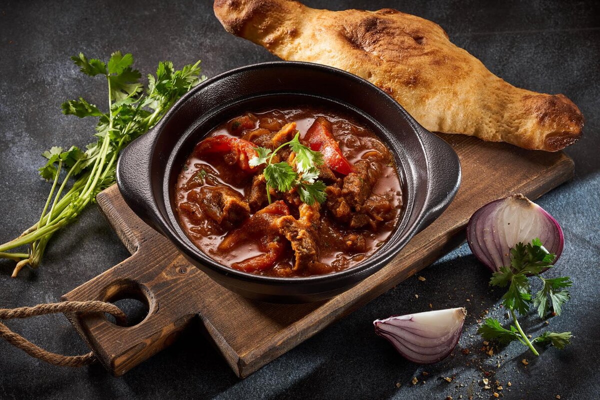 Чашушули — это одно из основных мясных традиционных блюд грузинской кухни, которое подается на первое. Готовить его несложно. К тому же есть множество рецептов, но суть у них одна: говядина или телятина тушится в томатном соке продолжительное время. Ингредиенты: Говядина — 500 г. Лук — 2 шт. Болгарский перец — 2 шт. Помидоры — 3-4 шт. Чеснок — 5 зубчика Перец чили — по вкусу Соль, черный перец, хмели-сунели — по вкусу Сливочное масло — 10 г. Процесс приготовления: Мясо нарезать кубиками и обжарить в масле, посолить. Как только мясо начало приобретать корочку, добавить лук, обжарить, добавить сливочное масло и болгарский перец, обжарить. Помидоры очистить от кожуры, нарезать кубиками, отправить к мясу, и следом добавить перец и хмели, все перемешать и залить кипятком. Оставить тушиться под крышкой 40 минут, за 5 минут до готовности добавить чеснок. Приятного аппетита! Рецепт и фото: свободные интернет-источники