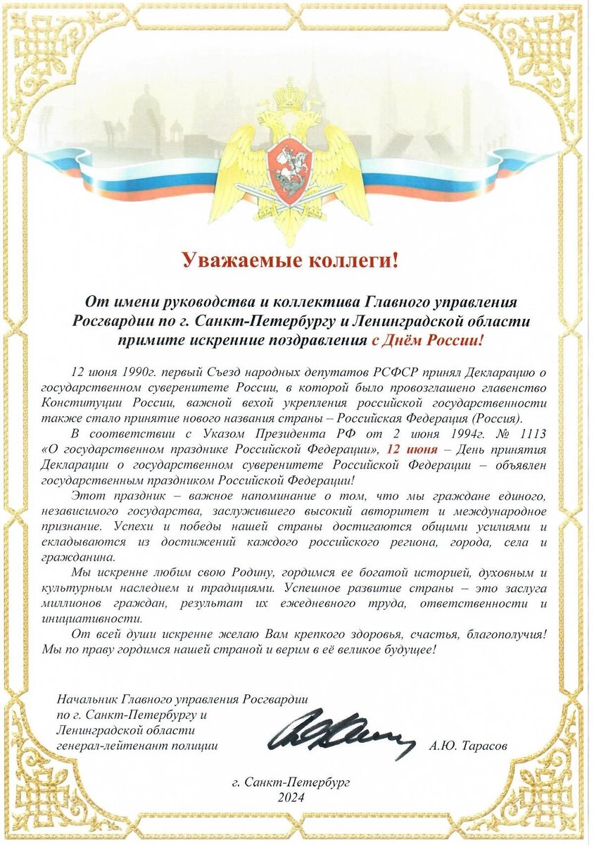 Поздравление начальника ГУ Росгвардии генерал-лейтенанта полиции А.Ю.Тарасова с Днём России