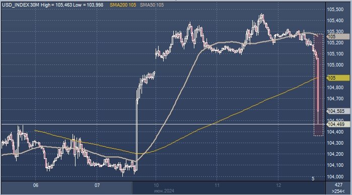 Данные по инфляции вышли всего за несколько часов до решения ФРС по ставке, которое будет объявлено в 21:00 мск. Доллар США был самой слабой валютой среди представителей Большой десятки, терял в цене против всех основных конкурентов и против более чем половины валют стран с развивающимися экономиками после публикации отчета по потребительской инфляции в США по итогам мая. График индекса доллара интервалами в 15 минут Более 1% прибавляли к доллару в группе G10 шведская и норвежская кроны, а также австралийский и новозеландский доллары. Нефть, алюминий, медь, никель, золото, серебро — все уверенно дорожали. Доходности 2-летних облигаций США снизились на 13 б.п. до 4,7%, а доходности 10-летних облигаций упали на 10,7 б.п. до 4,297%, намереваясь сформировать новые минимумы с конца марта. График курса евро/доллар интервалами в 15 минут Ключевой показатель базовой инфляции в США снизился в мае второй месяц подряд, что стало приятным сюрпризом для чиновников Федеральной резервной системы, кот