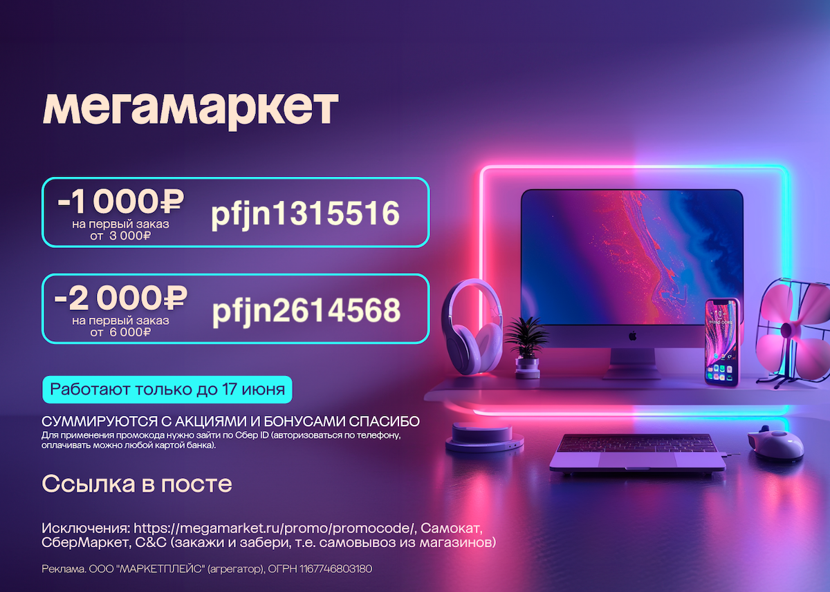 На Мегамаркете можно найти практически любые товары в категориях: 💻 Электроника, компьютеры и любая техника, 👗 Одежда и обувь, 💄 Красота и уход, 🧸 Детские товары, 🚘 Автотовары, 🪑 Мебель, 🔧 Строительство и ремонт, 🍏 Продукты питания, ⚽️ Все для дома, хобби и спорта, 🐈 Зоотовары. Ниже новые промокоды (внимательно читайте условия их применения). Для всех: 🟣 скидка 300 ₽ от 700 ₽ по промокоду СОЛНЦЕ на товары продавца Мегамаркет с витрины «2 часа» (для городов: Волгоград, Казань, Ярославль, Томск, Кемерово, Пенза, Тюмень, Пермь, Москва, Воронеж, Новосибирск, Самара, Краснодар, Санкт-Петербург, Нижний Новгород, в пределах зоны доставки) 🟣 скидка 300 ₽ от 700 ₽ по промокоду ФАСТ на товары продавца Мегамаркет с витрины «2 часа» (для городов: Челябинск, Екатеринбург, Уфа, Анапа в пределах зоны доставки витрины) На первый заказ: 🟣 скидка 1000 ₽ на заказ от 3000 ₽ по промокоду pfjn13155169 на всё, кроме товаров продавцов Самокат, СберМаркет и кроме самовывоза из магазинов 🟣 скидка
