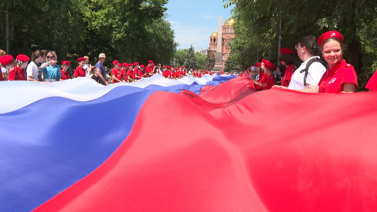 Сегодня Волгоградская область вместе со всей страной отметила День России. По регионам прошли праздничные мероприятия. Граждан объединяет общая идея любви и уважения к Родине, гордость за свою страну и ее символы, историю и достижения. Одно из самых ярких событий этого дня – флешмоб «Флаг России» – по Аллее Героев активисты общественных организаций, волонтеры и представители различных организаций пронесли стометровое полотно. День России – праздник для жителей большой страны – объединяющий. И отмечают его всегда вместе. Стометровый триколор разворачивают десятки волгоградцев, чтобы бережно пронести по центральным улицам героического города. Акция уже не первый год собирает настоящих патриотов Отечества. «На самом деле День России – это один из самых главных государственных праздников нашей страны. Эта акция раньше проводилась только на День Флага. Но с 2022 года мы начали проносить уже этот огромный триколор и на День России, чтобы как можно больше жителей Волгограда, больше молодежи