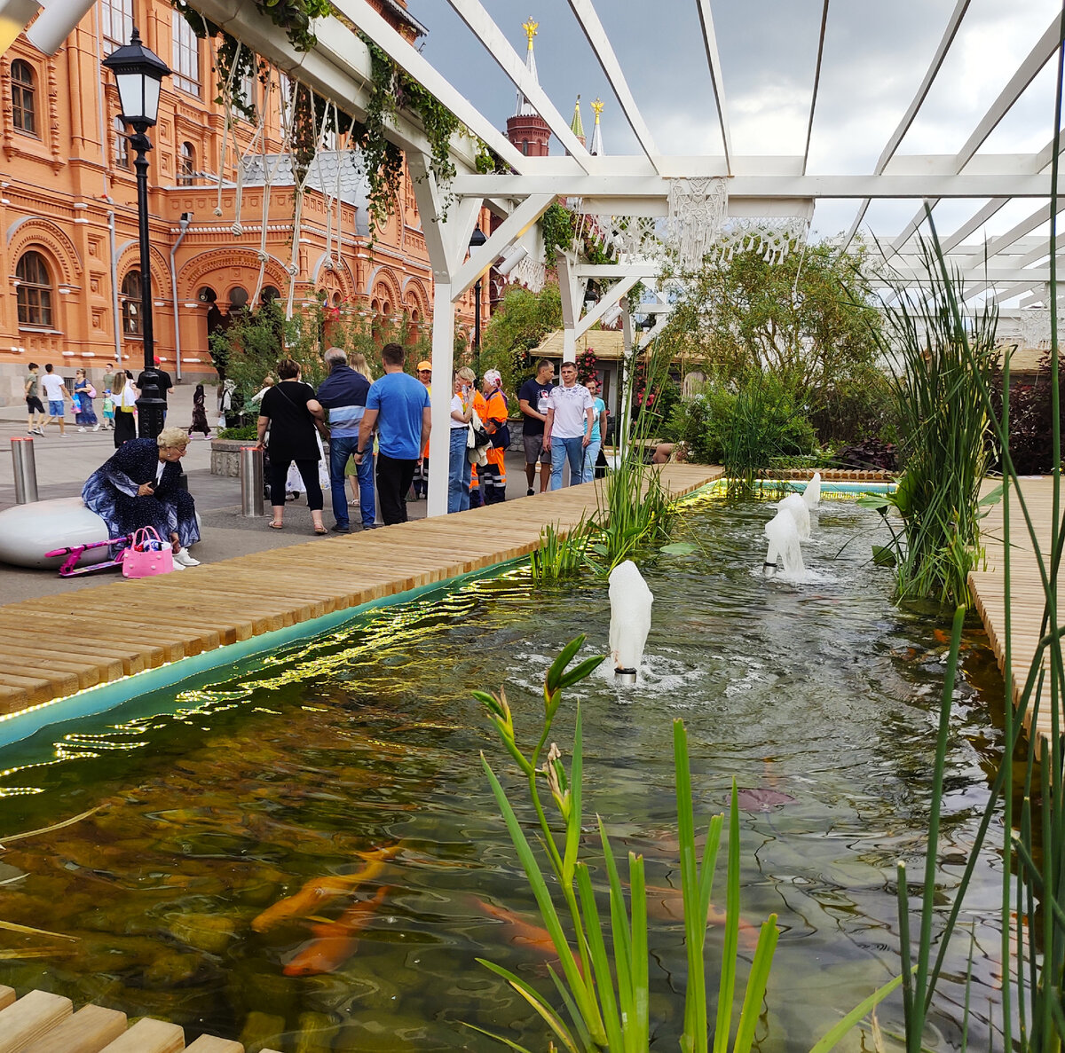 Сегодня специально для канала побывала на Красной площади. Хочется держать своих подписчиков и читателей в курсе всего, что происходит в Москве. По крайней мере в такой праздник. Я давно не была в Центре, поэтому сегодня впервые увидела прекрасный летний городок, построенный напротив метро Площадь Революции. В этот раз оформители превзошли себя. Обычно нас радуют цветами, а в этот раз решили порадовать водоемами с фонтанчиками и даже с живыми рыбками. Вот такие красавцы плавают недалеко от Красной площади. Вокруг водоемов построены зоны отдыха для горожан. Можно посидеть и отдохнуть. А можно и перекусить немного. По периметру городка есть красивые киоски с едой. В общем все очень красиво и уютно. Мне очень понравилось. Чуть дальше, напротив памятника Жукову расположена еще одна интересная зона. Но я ее не успела сфотографировать. Налетел прямо ураганный ветер, солнце закрыли тучи и начался прямо-таки настоящий ливень. Я успела это фото сделать когда дождь уже начался. Думала,
