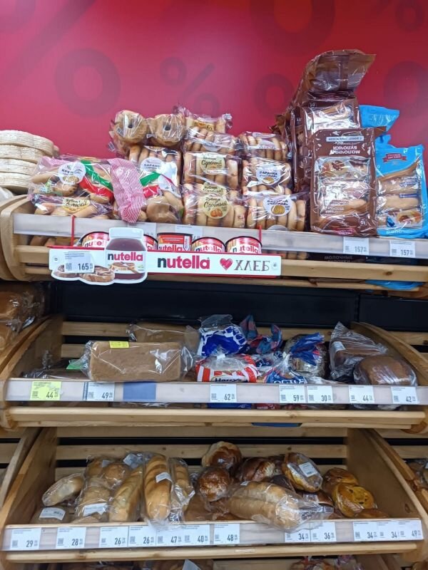 В «Самбери« производители хлебной продукции не указаны, в большинстве своём на ценниках стоит надпись «печём сами». Здесь булку белого хлеба весом в 200 г можно взять за 16,99 руб. Хлеб заливной (400 г) стоит 42,90 руб., а «Белый приморский» (400 г) — 40,90 руб. 100-граммовый хлеб пшенично-ржаной обойдется в 22,90 руб., «Московский» (300 г) — 40,90 руб., «Питерский» (250 г) — 36,90 руб., «Бородино с тмином» (250 г) — 44,90 руб., а «Купеческий с семечками» (250 г) — 46,90 руб.