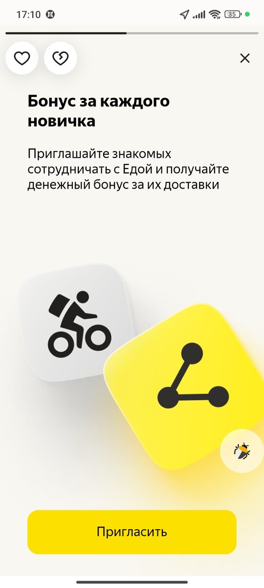 За приглашение новичка сейчас дают 17к ₽, половину которых я готов отдать ему по мере получения этого бонуса. Есть условия: — новичку нужно выполнить 110 заказов; — если ты сотрудничал с сервисами Яндекса (Еда, Такси, Лавка, Доставка) и с последнего заказа прошло 60 дней; — после получения от меня ссылки на регистрацию, нужно в течении семи дней активироваться. Можно быть курьером: —пешим/вело/электровело/мото/авто — если в твоем городе/поселке/деревне работает сервис Яндекс. Как всё пройдёт: — пиши в комменте свой ник в телеграмм для получения от меня ссылки на регистрацию; — регистрируешься, активируешься; — выполняешь 110 заказов (за которые ты получишь деньги); — по мере получения мною бонуса, я буду переводить тебе 50% от него. Бонус разделен на три части и соответствует прогрессу новичка в выполнении количества заказов. 110 заказов выполняются в течении одной недели или двух, как посчитаешь нужным. Если есть вопросы, то пиши смело