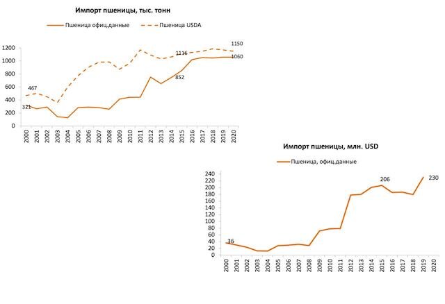 Основной импортируемой культурой в Таджикистан является пшеница. Данные об объемах импорта в страну носят противоречивый характер. По информации USDA импорт пшеницы в Таджикистан в отдельные периоды (2003-2013гг.) в несколько раз превышал официальные объемы импорта, публикуемые UN Comtrade и FAO. Это может быть связано как с высокой долей незаконного ввоза сельхозпродукции на территорию страны, так и с несовершенством системы статистического учета. Объемы импорта пшеницы в Таджикистан до 2016гг. росли высокими темпами, что объясняется развитием в стране мукомольного производства (в том числе и за счет импортного сырья). В 2020 году Таджикистан импортировал по официальным данным 1,06 млн. тонн пшеницы на сумму 230 млн. USD. #Таджикистан #импорт #пшеница # USDA # FAO