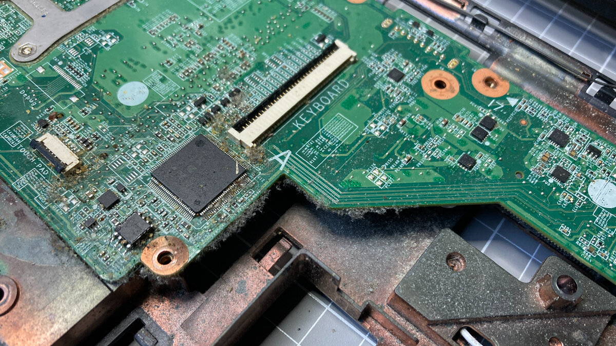 Принесли ноутбук с типовой болячкой, при открытии матрицы идет подъем топкейса, который пытается вырваться из своего посадочного места. Подразобрав ноутбук я увидел его состояние изнутри