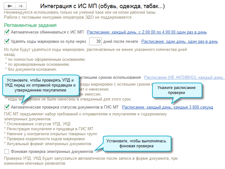 В программе «1С:Бухгалтерия 8» начиная с версии 3.0.148 в обмене с ГИС МТ «Честный знак» добавлена возможность автоматической проверки статусов универсальных передаточных документов (УПД) и универсальных корректировочных документов (УКД) в ГИС МТ «Честный знак» перед их отправкой на стороне продавца и утверждением на стороне покупателя. Это помогает выявить ошибки на этапе оформления документов. Добавлено отслеживание статусов УПД, УКД в ГИС МТ. Проверяется выполнение следующих условий: Для выполнения проверки нужно выполнить следующие настройки: Полный интерфейс: меню «Администрирование – Настройки программы – Интеграция с ИС МП (обувь, одежда, табак…)».