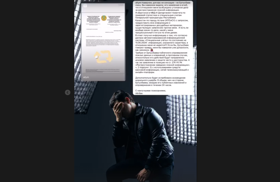 «Наверное, для вас не сенсация, но Ертысбаев – лжец. Вы, наверное, видели его заявление в YouTube, что в отношении меня возбуждено уголовное дело за распространение ложной информации. Я обратился в МВД и Департамент Комитета по правовой статистике и специальным учетам Генеральной прокуратуры Республики Казахстан по городу Астане (КПСиСУ) с запросом, предоставить мне информацию о зарегистрированных досудебных материалах, существующих заявлениях против меня. И есть ли вообще какие-то дела, какой у меня процессуальный статусе по этим делам», - написал Айтбек Амангельды.