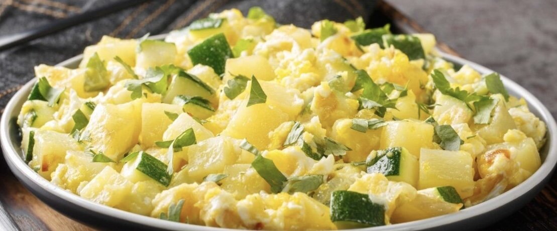 Простое и аппетитное блюдо легко приготовить. Чтобы получилось сытнее, можно добавить отварную картошку. 📝 Ингредиенты: Небольшие цукини или обычные кабачки — 1–2 штуки Небольшая луковица — 1 штука Растительное масло — 2–3 ст. ложки Соль — по вкусу Перец чёрный молотый — по вкусу Яйца — 5 штук 👩🏻🍳 Процесс приготовления: 1․ Кабачки и картошку, если хотите добавить её, нарежьте небольшими кусочками. Лук измельчите. 2․ В сковороде разогрейте масло на среднем огне. Обжарьте кабачки с луком до мягкости. 3․ Добавьте картошку и готовьте всё вместе ещё 3–4 минуты, чтобы она прогрелась. Слегка посолите. 4․ Венчиком или вилкой взбейте яйца с щепоткой соли. Влейте в сковороду и, помешивая, обжаривайте ещё 3–5 минут. Перед подачей можно добавить мелко нарубленную зелень. Приготовить легкий и полезный завтрак очень даже несложно, тем более что и продукты для него нужны доступные, да и времени на приготовление требуется немного. Лучше всего для этого блюда взять совсем молоденькие кабачки, они