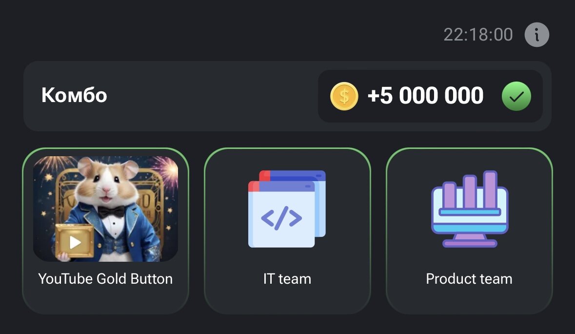 1 карта находится во вкладке PR&Team и называется IT team 2 карта находится так же во вкладке PR&Team и называется Product Team 3 карта находится во вкладке Special и называется YouTube Gold Button Покупаем по 1 уровню, каждой карты, получаем комбо и лутаем 5 млн. монет!