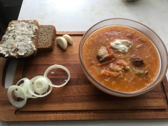 Для недели званого ужина расскажу рецепт своего быстросупа, который мне очень нравится. Первым делом беру большую сковороду, ставлю на максимальный огонь и добавляю мясную составляющую. Это могут быть фрикадельки, сосиски, кусочки говядины и т.п. В данном случае я нарезал купаты. Через минуты 3-4 добавляю обычную квашенную капусту с морковью. Я добавляю покупную. После ужарки капусты добавляю помидоры. Можно томатную пасту. Затем идёт бульон. На стакан 500мл воды 3\4 чайной ложки сухого бульона типа роллтона, магги или доширака. Продаются в любом магазине. Как кубики, только быстрее растворяется. У меня говяжий. И добавляю в сковороду. После закипания бульона обязательно добавляю хорошую ложку перемолотого сала с чесноком. Дает насыщенность и нажористость. Специи по вкусу. Мой выбор - это перец, паприка, сухой чеснок. Соль не добавляю, т.к. капуста и сало прилично соленые. Как только сало растворилось, суп готов. Вуаля, я великолепен! В основном готовлю зимой. Подаю со сметаной, черным