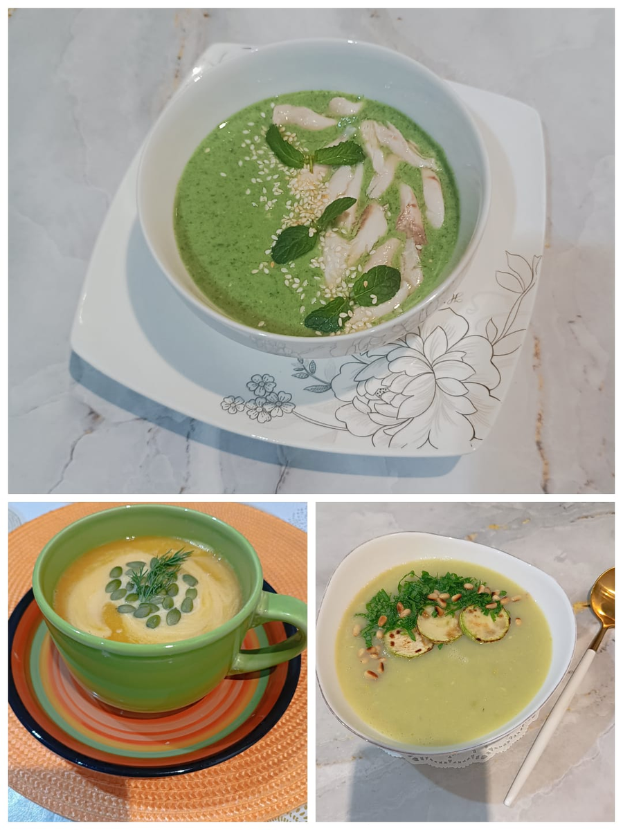 Абсолютно аналогично: натереть или мелко нарезать тыкву и лук и варить 15-20 минут. Остудить и блендернуть. Заправлен сметаной, дополнен тыквенными семечками и куриным бедром ) Собиралась сварить так же только капуста+лук, но остался шпинат от вкусного пятничного завтрака. С шпинатом наряднее ) Капусту мелко нашинковать, лук нарезать, загрузить одновременно и варить 15