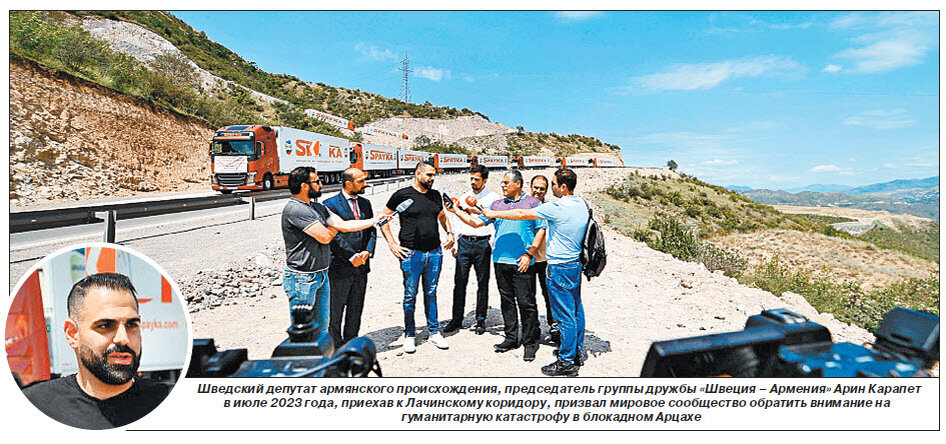 И все же активисты армянской общины не сдались. В частности, в прошлом году провели автопробег по дорогам королевства с призывом к европейским странам и рассеянному по миру армянству не замалчивать геноцид прошлого столетия и совершаемый Азербайджаном в ХХI веке на глазах международного сообщества новый геноцид в Арцахе. Об этом же написал на своей странице в соцсети шведский депутат армянского происхождения, председатель группы дружбы «Швеция – Армения» Арин Карапет, побывавший в июле 2023 года в Лачинском коридоре: «Фуры с гуманитарным грузом – тоннами продуктов, медикаментов и прочих предметов первой необходимости – стоят в Корнидзоре из-за незаконной блокады Арцаха Азербайджаном. А в это время 120 тысяч жителей Нагорного Карабаха, ожидающих помощи, остаются под угрозой голода и ухудшения здоровья. Ситуация очень тяжелая, срочно необходимы международные усилия как для восстановления поставок гуманитарной помощи, так и свободного передвижения гражданского населения. Мы должны действовать немедленно, чтобы арцахцы получили поддержку, необходимую для выживания и восстановления жизни. Международное сообщество не должно молчать!» Но международное сообщество привычно ограничилось лишь сочувственными вздохами.