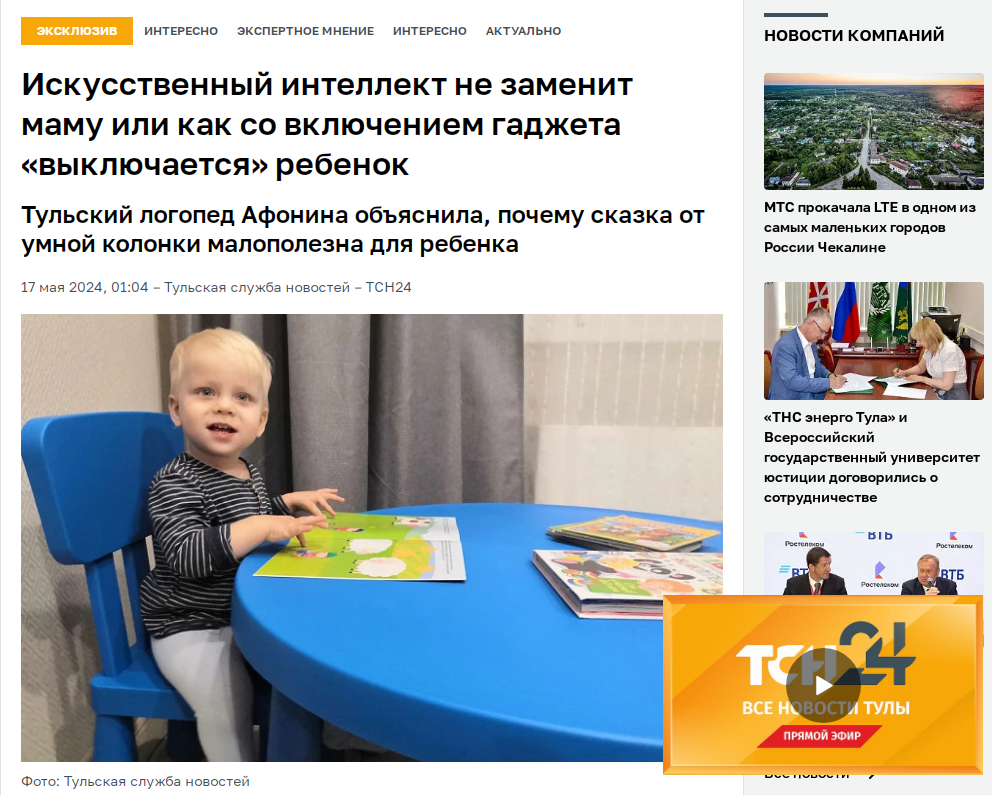 Тульская служба новостей (ТСН24) готовила материал о чтении, книгах и развитии детской речи. Искренне благодарна ТСН24 за приглашение стать экспертом и возможность высказать свое мнение. Здесь вы можете увидеть итоговый вариант статьи (https://www.tsn24.ru/2024/05/17/307963-iskusstvennyy-intellekt-ne-zamenit-mamu-ili-kak-so-vklyucheniem-gadzheta-vyklyuchaetsya-rebenok-/), а ниже прочитать мой комментарий целиком.