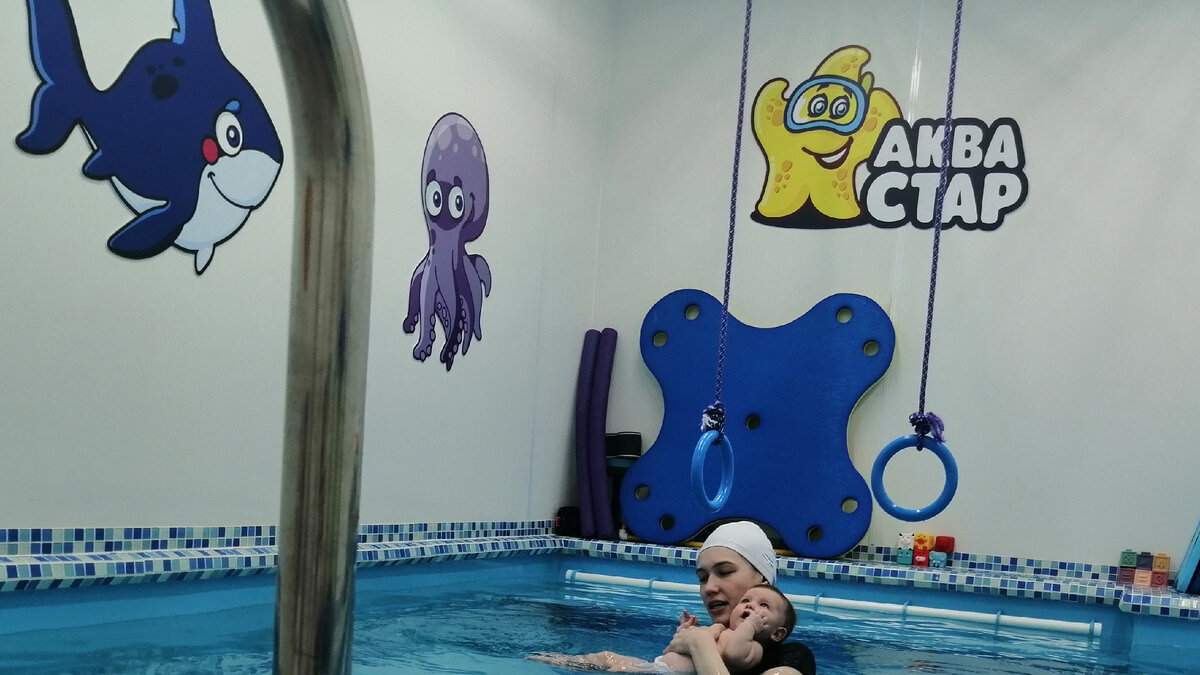 Наступил у меня такой долгожданный, но короткий отпуск, появилось свободное время, и напросилась я поехать с детьми на то самое "грудничковое плавание", куда они на протяжении полутора месяцев раз в неделю возят нашу малышку, посмотреть своим строгим бабушкиным взглядом, как там все происходит! 😀 Я почему то представляла себе большое помещение, возможно при каком-то Фитнес-центре, где много людей, детей.. Но приехали мы в небольшую, уютную студию. Разделись во взрослой раздевалке, прошли через небольшую игровую зону для более взрослых деток в малышковую раздевалку, которая находится уже непосредственно перед бассейнами. Бассейнов оказалось несколько маленьких, в каждом из них один тренер проводит занятие с одним ребёнком. Мы приехали немного раньше положенного времени, поэтому минут 15 пришлось развлекаться самостоятельно. За пару минут до занятия быстренько раздели малышку, сполоснули в душе (обязательное требование!), надели акваподгузник и передали свое чадо тренеру! За трен